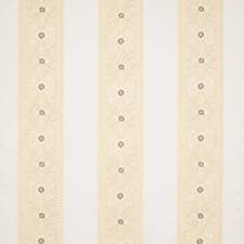 An eye-catching embroidered stripe featuring floral medallions and scrolling f lourishes that elegantly form cartouches. The interplay of dark and cream satin stitch emulates decorative strapwork, beautifully contrasted against soft printed stripes, evoking a distinctly Classical style with timeless sophistication.