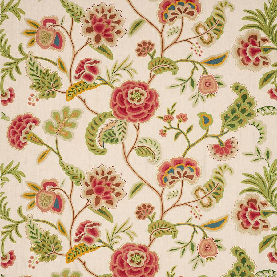 Inspired by a 17th-century English crewelwork bedhanging, this stunning signature design showcases a rich blend of embroidery techniques. Francine embraces the Jacobean style, featuring stylised leaf and flower motifs that celebrate nature’s beauty. Its handcrafted appeal comes from two distinct embroidery layers: a fine yarn base topped with woolly yarn worked by hand in chain stitch. This layering creates remarkable depth, with varied colours and textures that enrich the design. A luxurious, decorative embroidery that honours our British heritage.