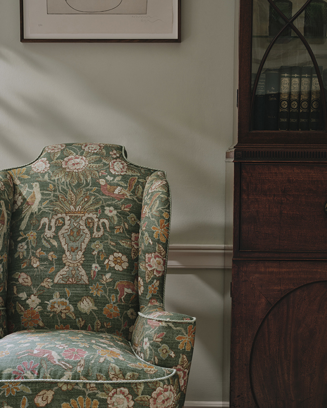 Fleury is a richly textured and distinctive print, inspired by a 20th-century carpet fragment in the Persian tradition. A joyful medley of stylised birds, animals, and flowers lends the design a whimsical, enchanting character. The subtle tonal variations of the original are masterfully reimagined through layered colour, evoking the depth and texture of antique carpet pile with remarkable skill.