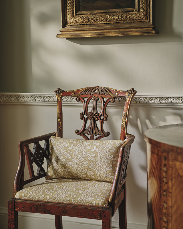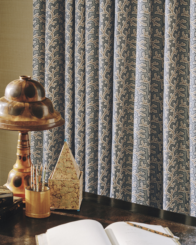 This striking interlocking coral design is developed from a nineteenth-century document. Each coral form is defined by a finely painted neutral outline that sits crisply against the tonal striped coloured grounds.