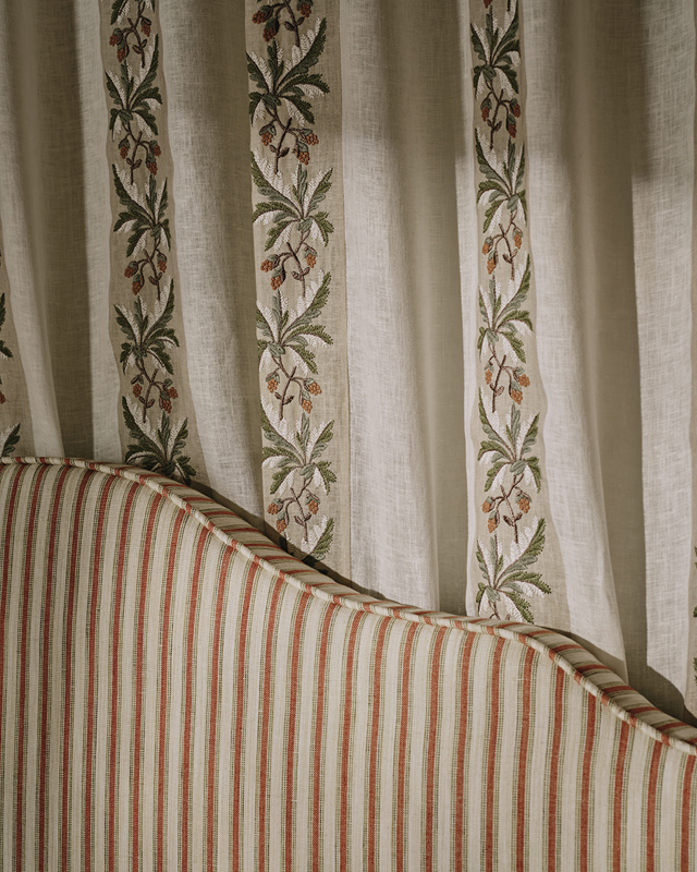 A classically proportioned smaller scale stripe that pairs considered colour combinations with a finely woven linen blend ground. Space dyed yarns introduce gentle tonal variation, lending the design asubtle antique character and added depth.