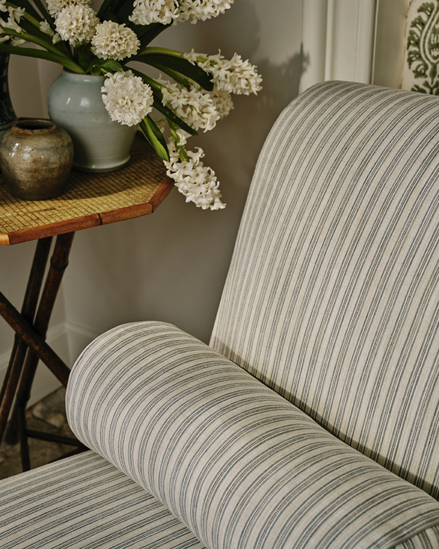 Lilla Stripe is a decorative weave defined by a small scale ticking stripe, finely woven in a linen blend with a crisp yet natural handle. Space dyed yarns introduce soft tonal variation, lending the design a gentle antique character and an appealing sense of depth.