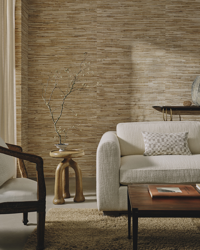 Handwoven from fine water hyacinth stems on a cotton warp, Anju reveals a richly tactile surface alive with natural colour variation and tone. Each roll carries its own distinct character, bringing warmth, depth and artisanal charm.