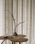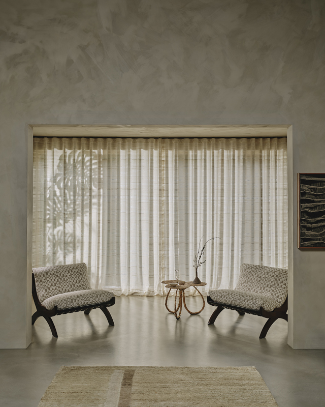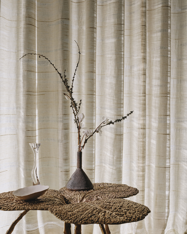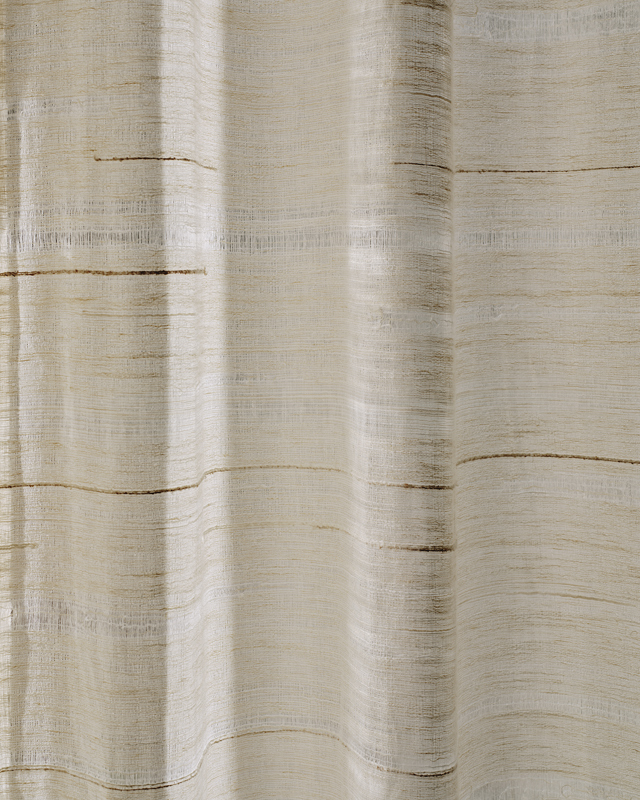 Salta blends linen, silk, and cotton into a delicate double-width sheer. A contrasting cut weft introduces an understated, irregular stripe that can be positioned vertically or horizontally, offering both elegance and versatility for refined interior settings.