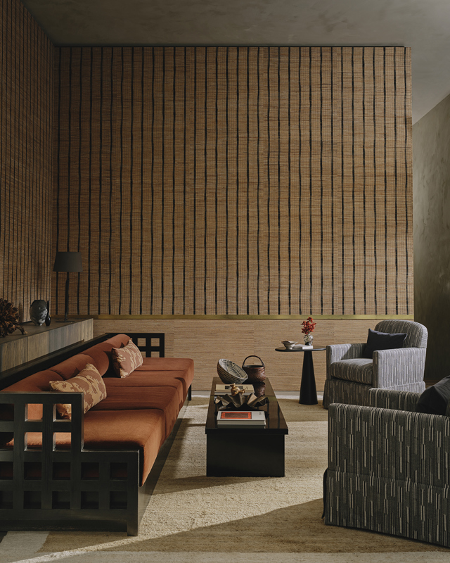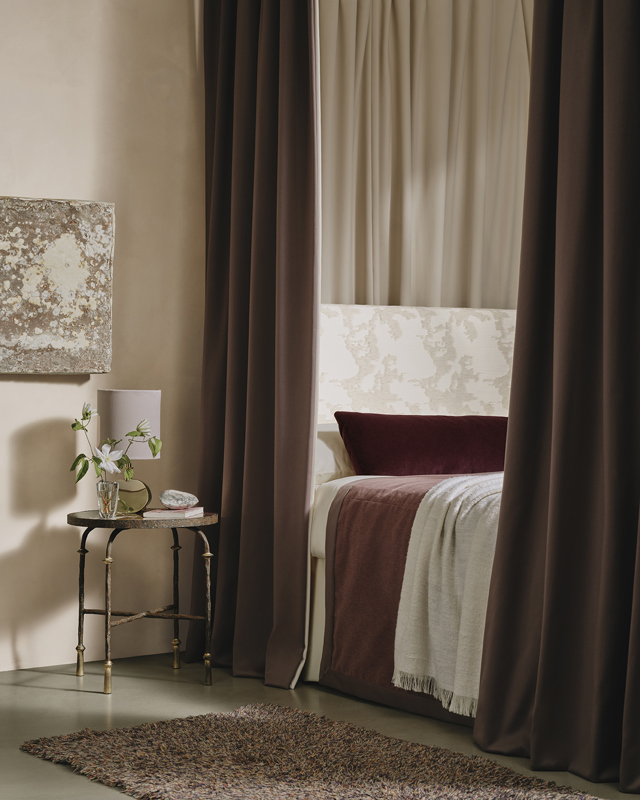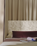 A tonal abstract motif unfolds through the fil coupé technique, a refined jacquard weave which produces a delicate and tactile fringe. The dynamic interplay of texture, raised relief, and subtle tone-on-tone shades creates a profound sense of timeless elegance, making this fabric a singularly refined choice for contemporary interiors.