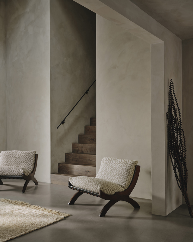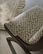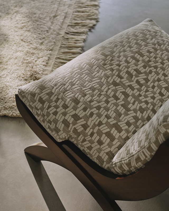 This small-scale jacquard has a natural warmth and an inviting tactile quality. Irregular linear shapes play across softly shifting vertical lines, creating gentle movement and depth in the weave. With its smooth touch and natural palette, the fabric brings a refined and calming presence to any interior.