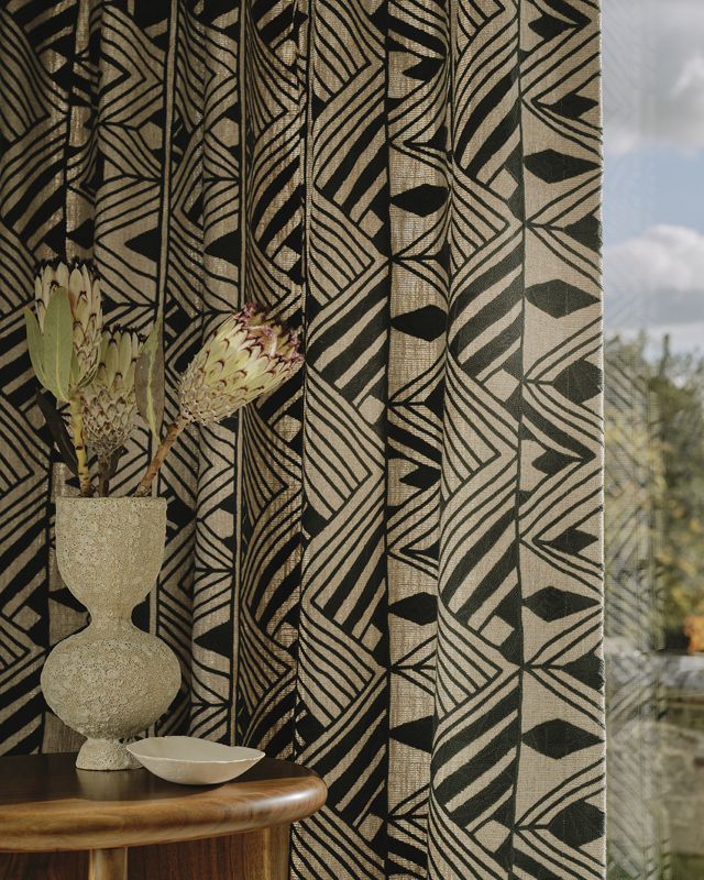 A dynamic motif unfolds across a soft textured ground through traditional crewelwork. Sculptural embroidery and an earthy palette bring a sense of warmth and authenticity, echoing the design’s roots in natural shapes and crafted tradition.