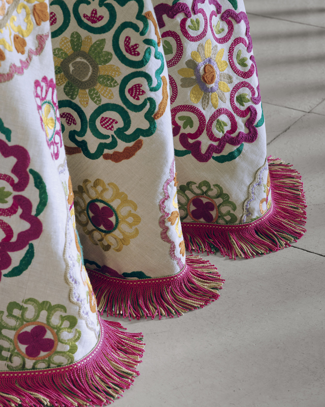 Taking inspiration from traditional Suzani while infusing it with a fresh and contemporary twist, this multicoloured embroidery design presents medallions and ornamental shapes on a gorgeous natural linen ground. The combination of embroidery techniques, including flat satin stitches and textured woolly crewelwork imparts a tactile and dimensional quality to this decorative fabric, enriching its visual appeal.