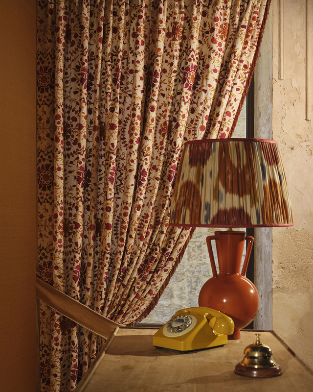 Traditional Uzbek weaving techniques inform this striking printed design, presenting a contemporary reinterpretation of a timeless ikat motif. Bold and joyful, its vibrant palette and grand scale captivate the eye.