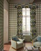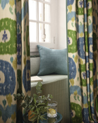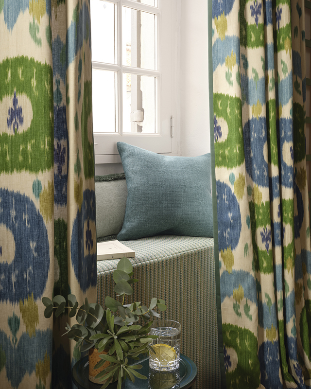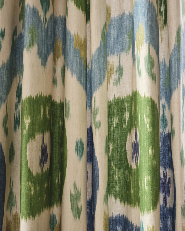 Traditional Uzbek weaving techniques inform this striking printed design, presenting a contemporary reinterpretation of a timeless ikat motif. Bold and joyful, its vibrant palette and grand scale captivate the eye.
