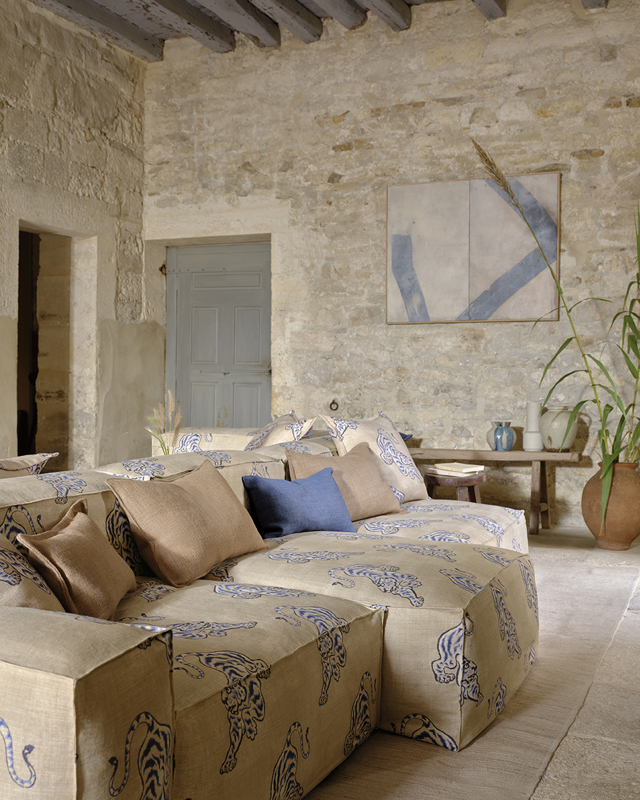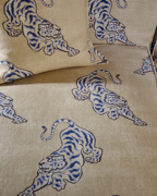 A majestic tiger print with undulating inky stripes unfolds across a patinated ground, its striking repeat creating a bold visual statement. Printed on a versatile linen, the printed ground has a rustic and artisanal feel.